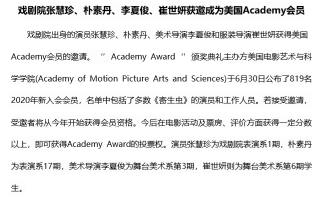 戏剧院张慧珍、朴素丹、李夏俊、崔世妍获邀成为美国Academy会员