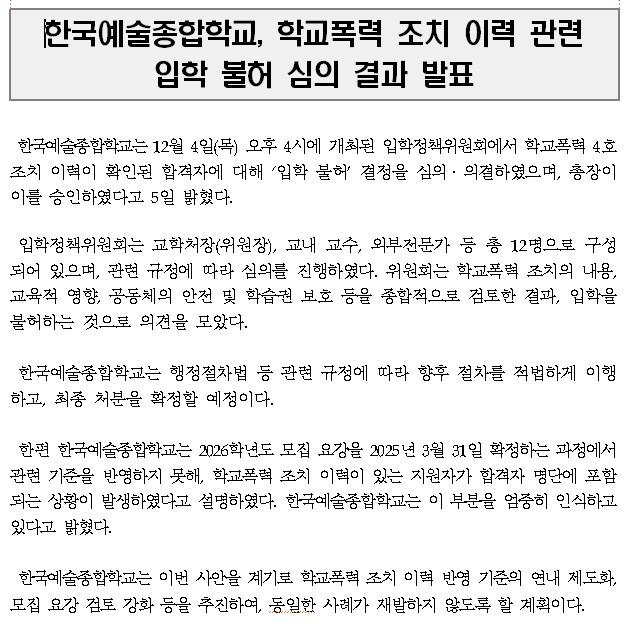 251205-한예종 학교폭력 조치 이력 관련 입학 불허 심의 결과 발표.hwp ( 286720 byte )
