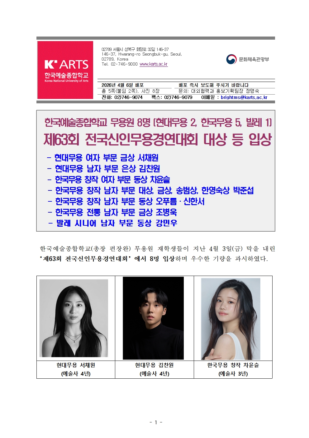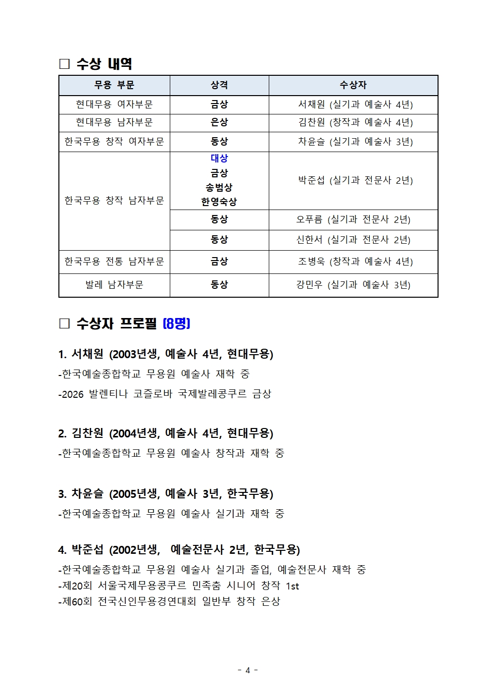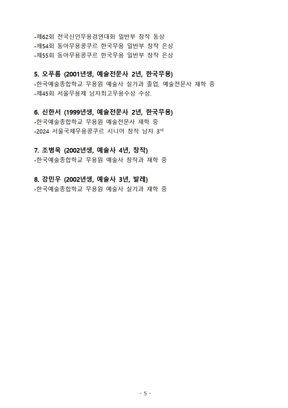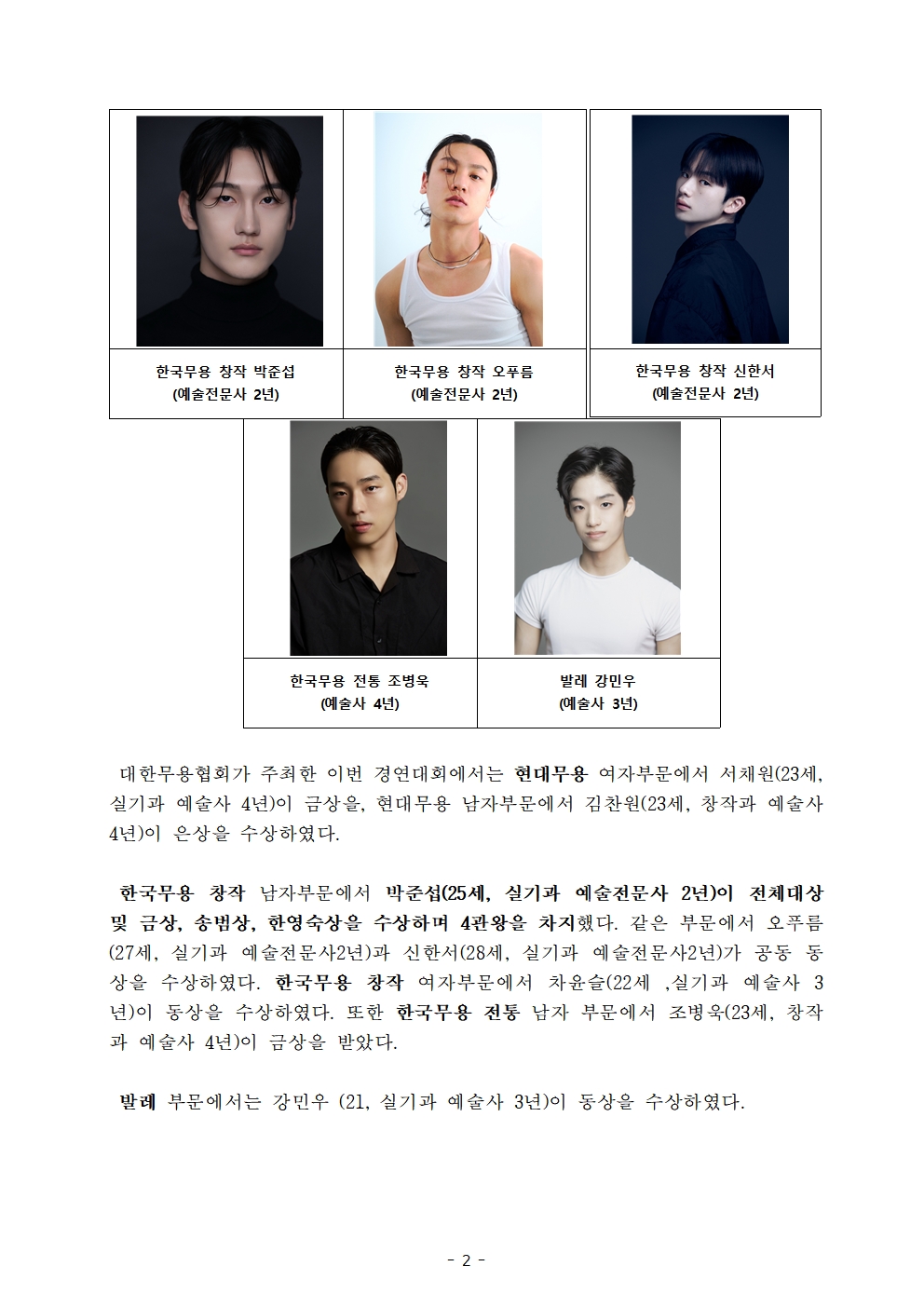 무용원 박준섭 제63회 전국신인경연대회 대상 등 8명 입상