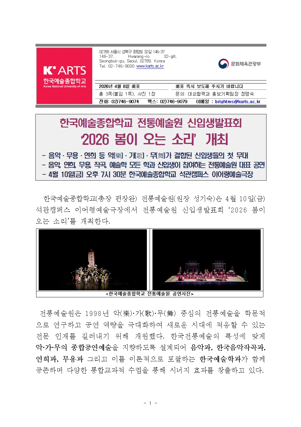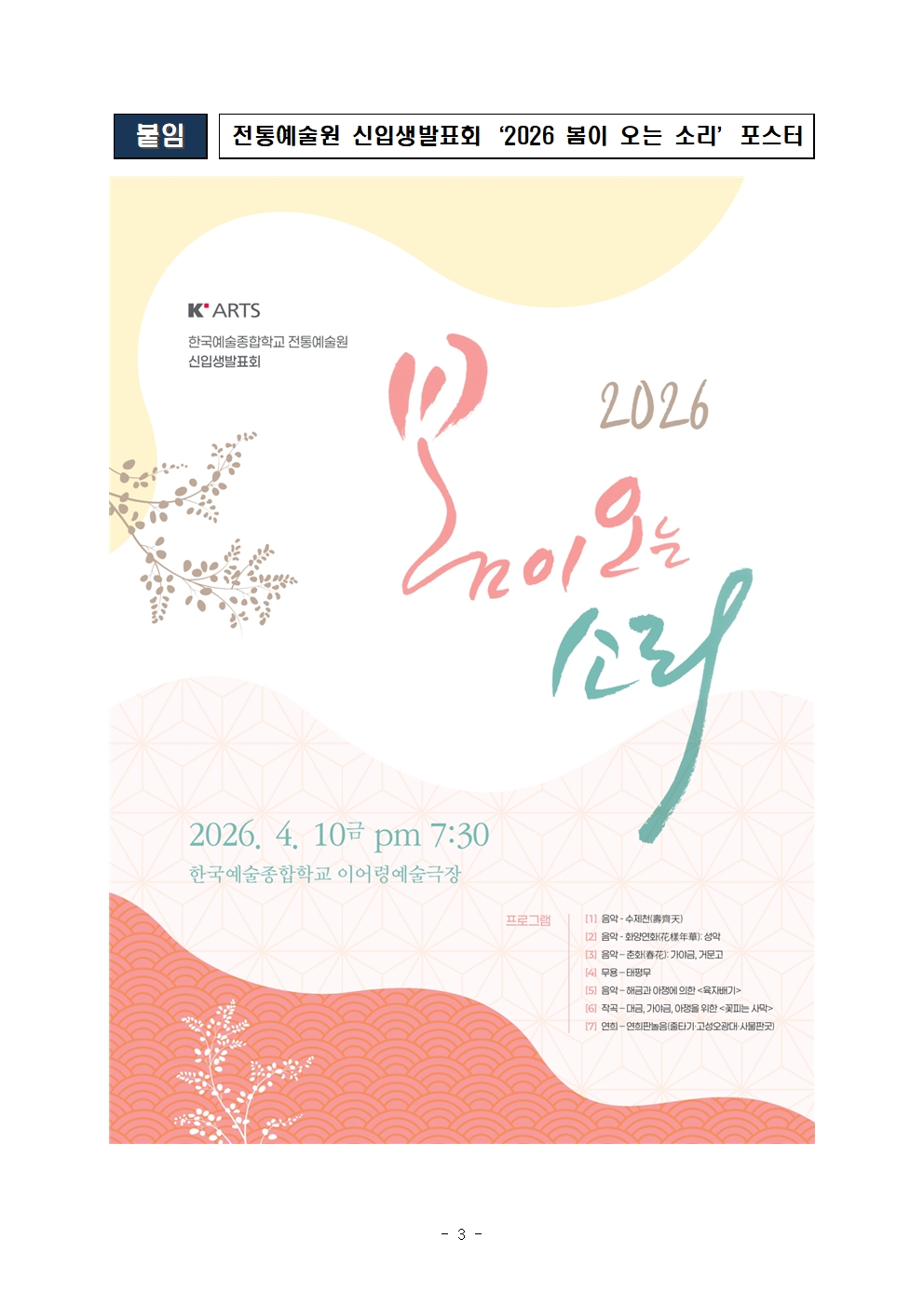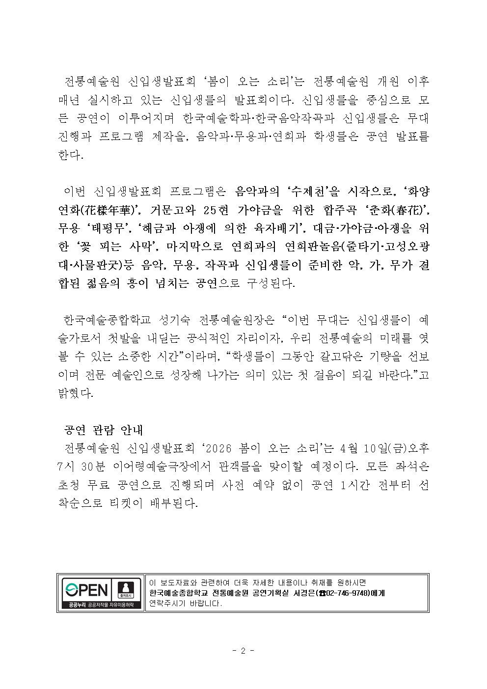 한예종 2026 전통예술원 신입생발표회 봄이 오는 소리 개최.hwp ( 1978880 byte )