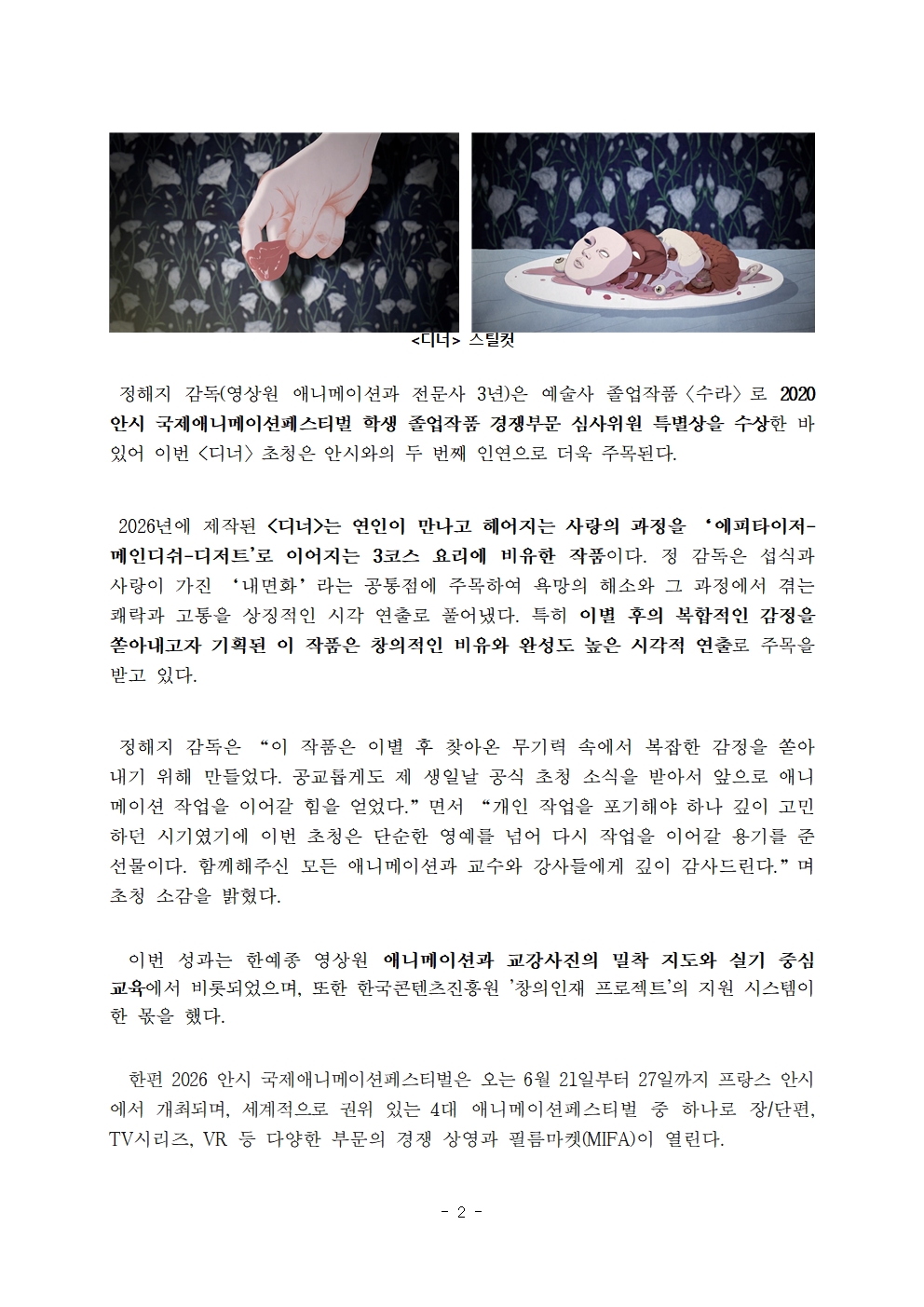 영상원 정해지 《디너》 2026 안시 국제애니메이션페스티벌 공식 초청